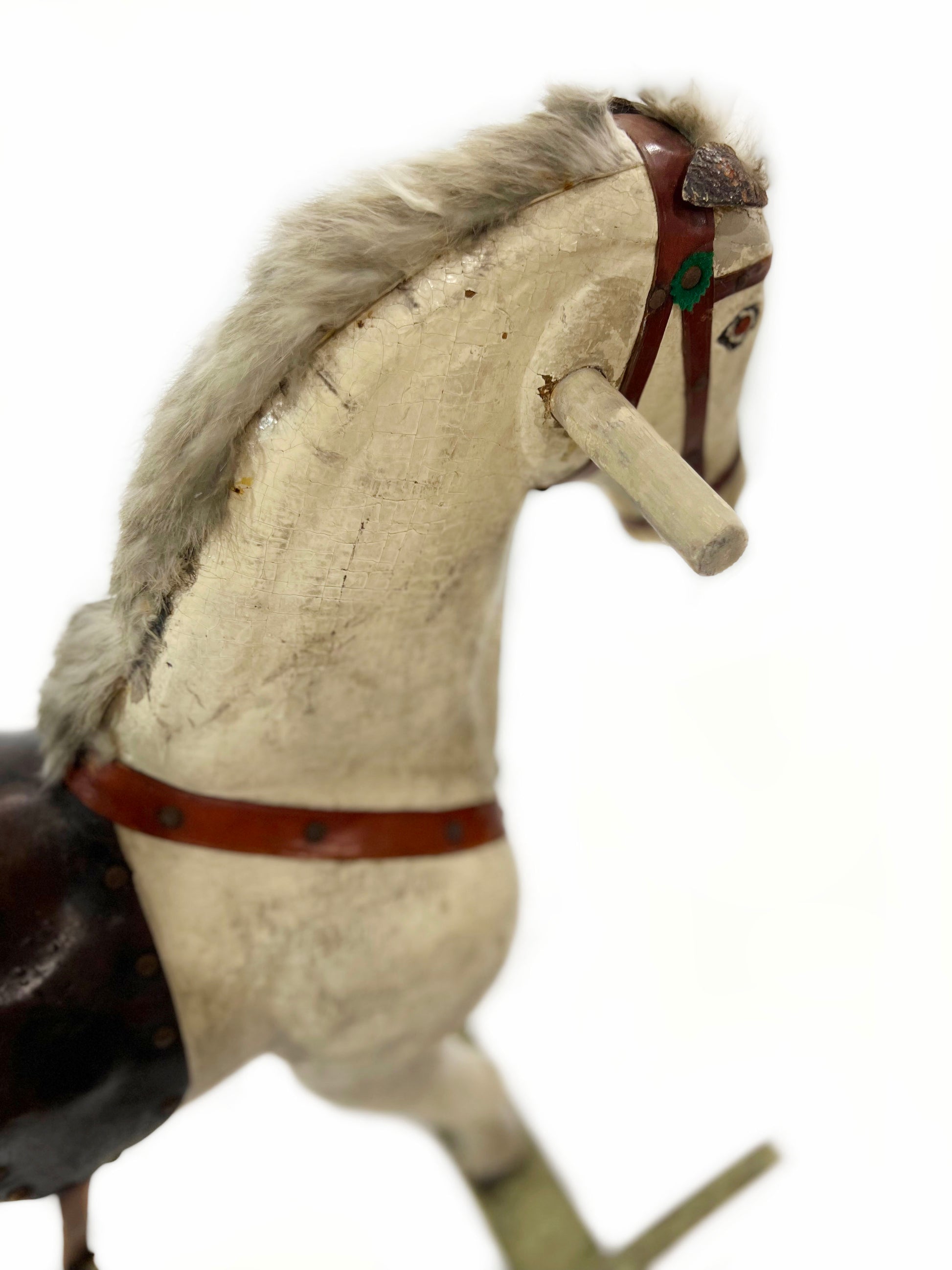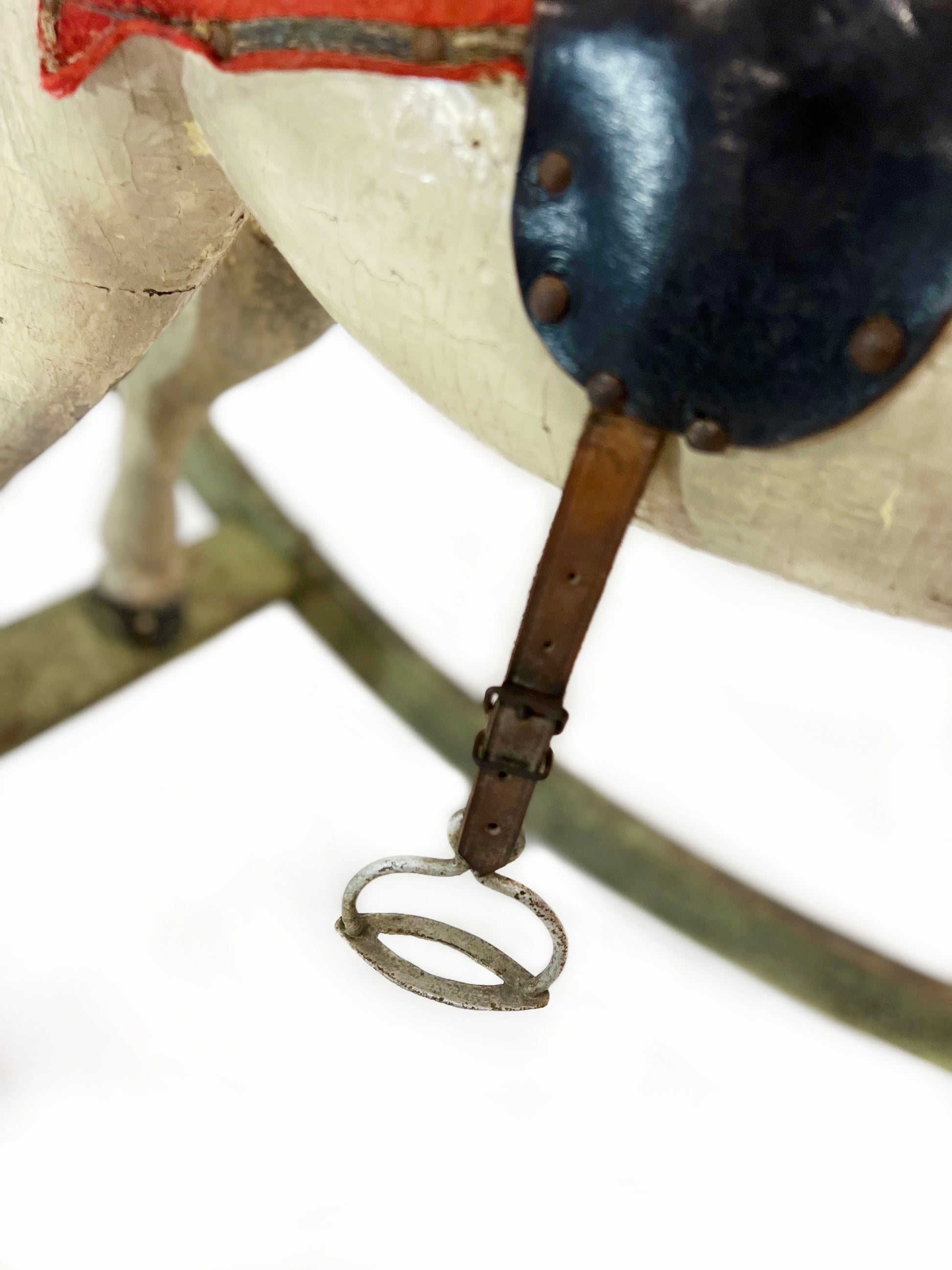 The rocking horse still has its original saddle, blanket, but has one stirrup missing and some of the bridle fittings are also missing.