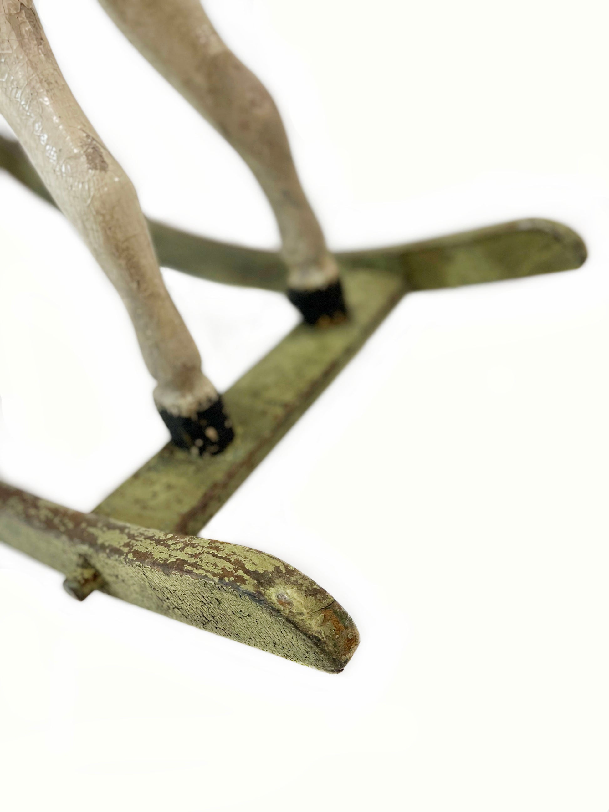 A charming 19th century child's hand carved wooden rocking horse, featuring lovely distressed original hand painted finish and mounted on its original bow shaped base.