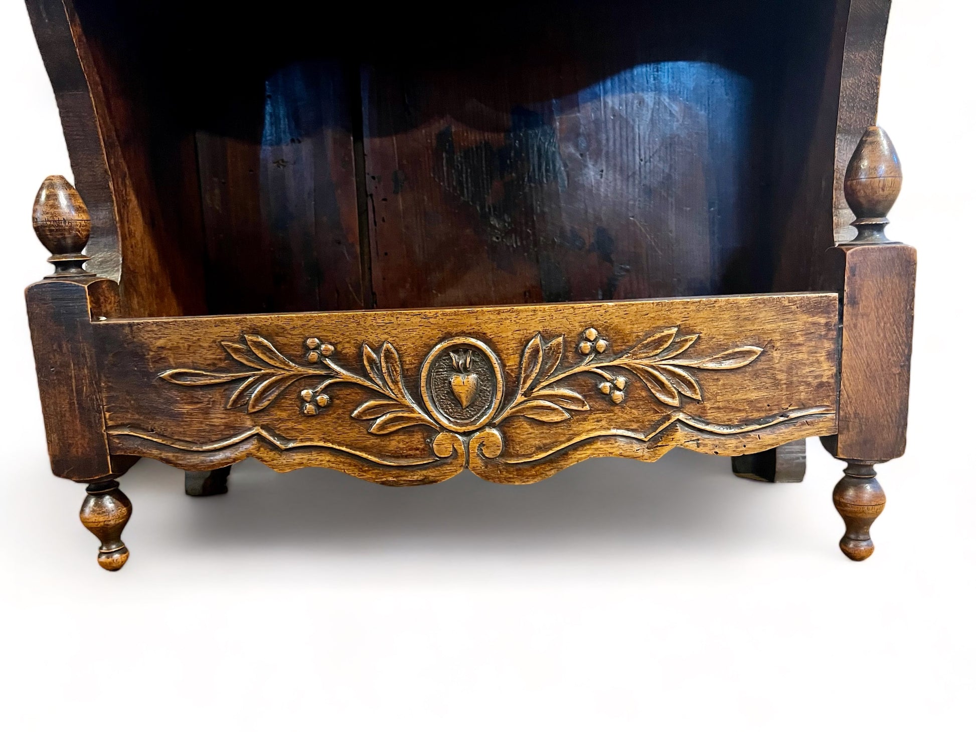 A antique 19th century French carved oak free standing spice rack, decorated with carved foliage on the front