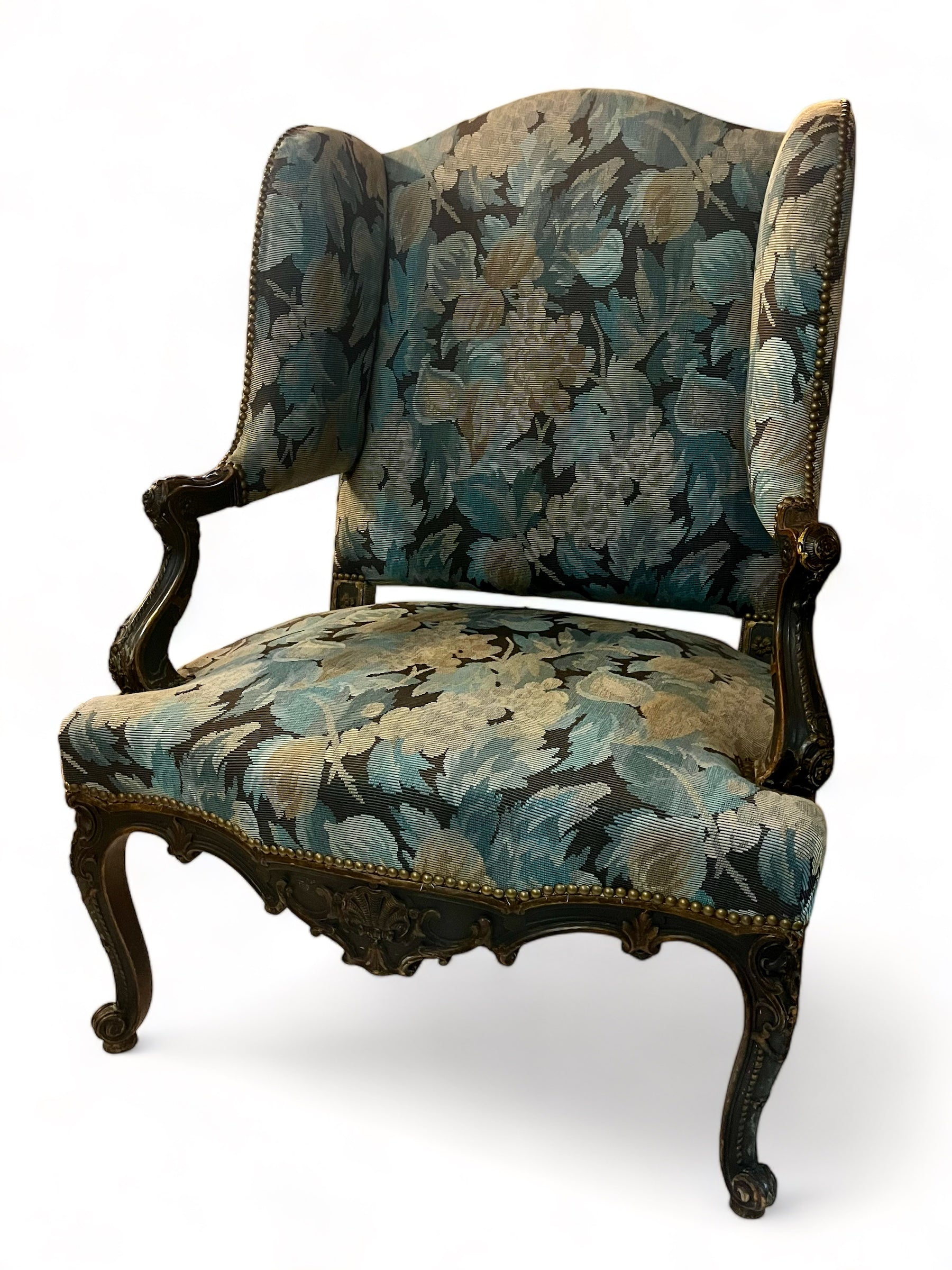 The upholstered winged backed arm supports are carved with the same pattern as the cabriole legs.