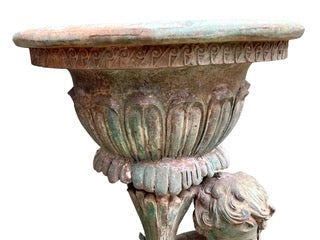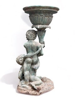 Mounted on a platform are two cherubs holding up a cornucopia with an urn mounted on top, the urn is the fountain bowl.