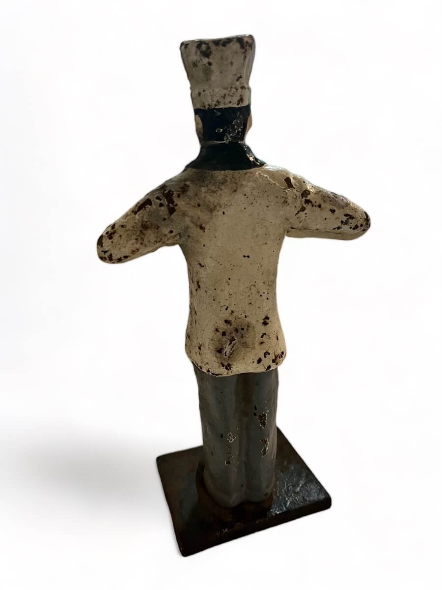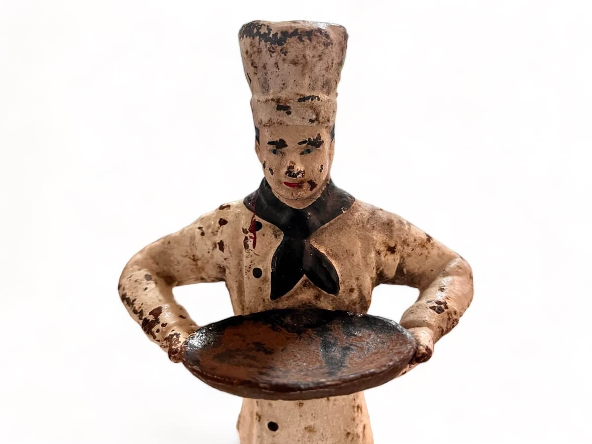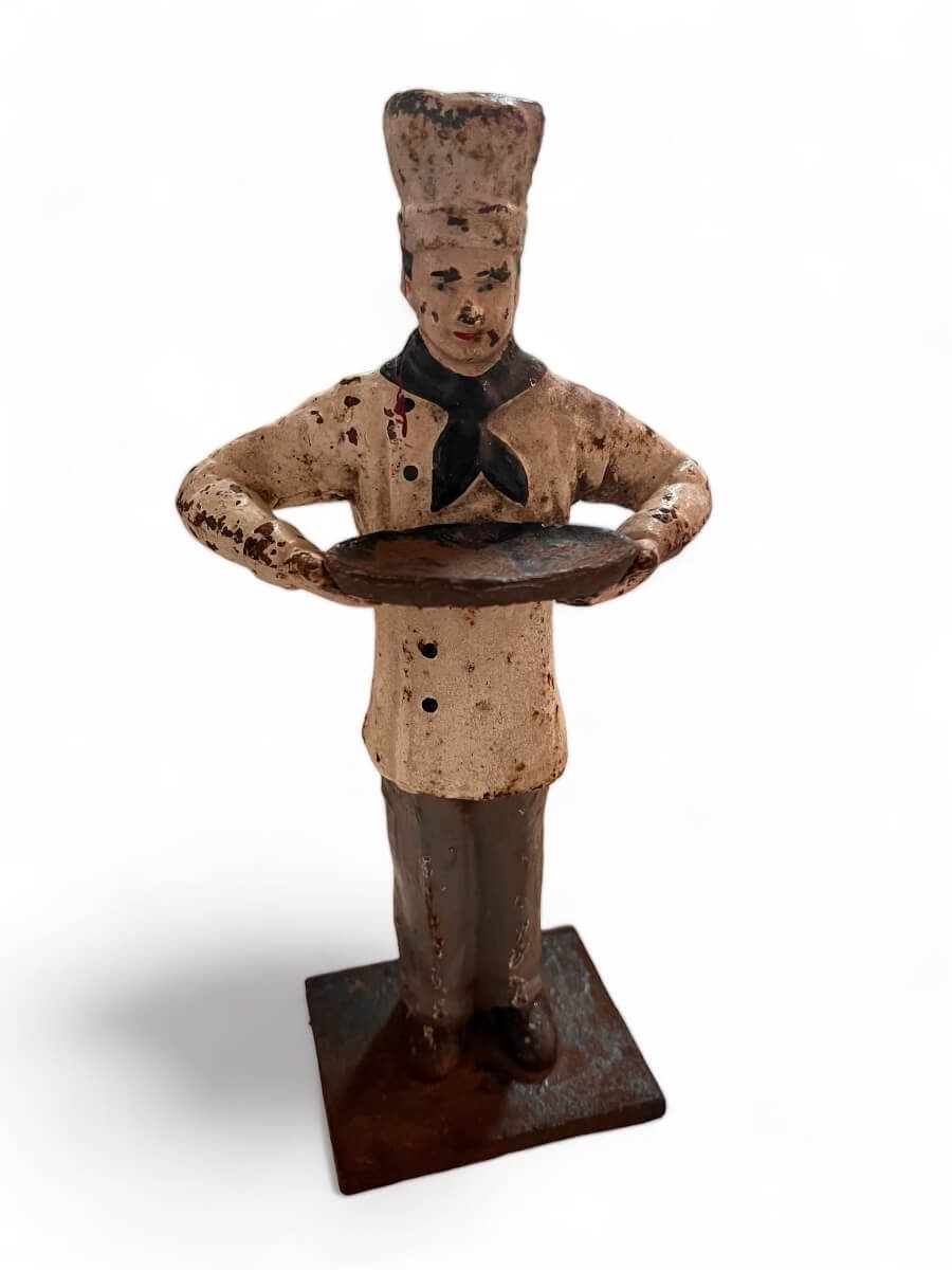 A 19th Century French cast iron Patisserie shop fitting in the form of a baker from the era holding a try to display the daily favorite pastry or cake.