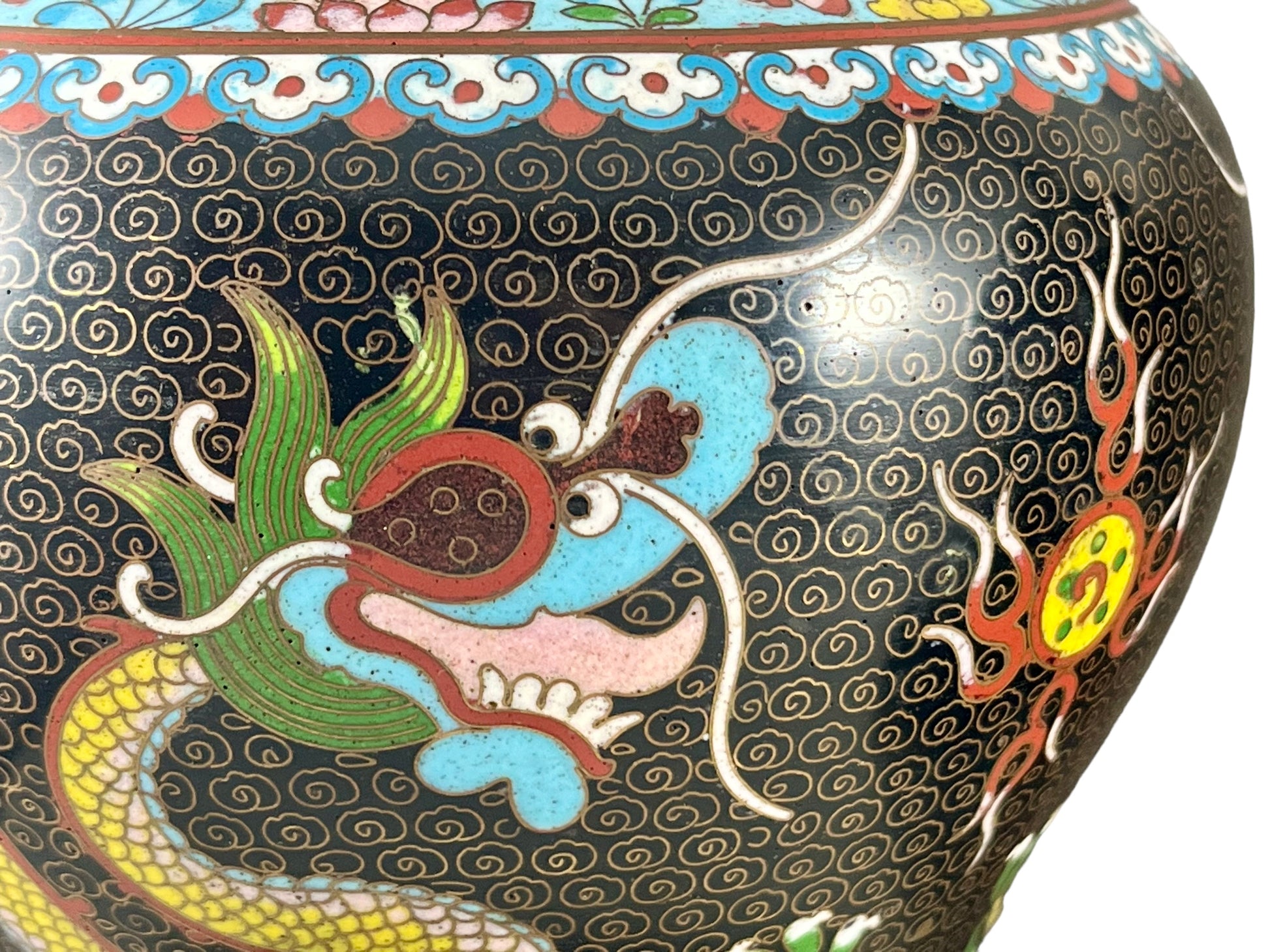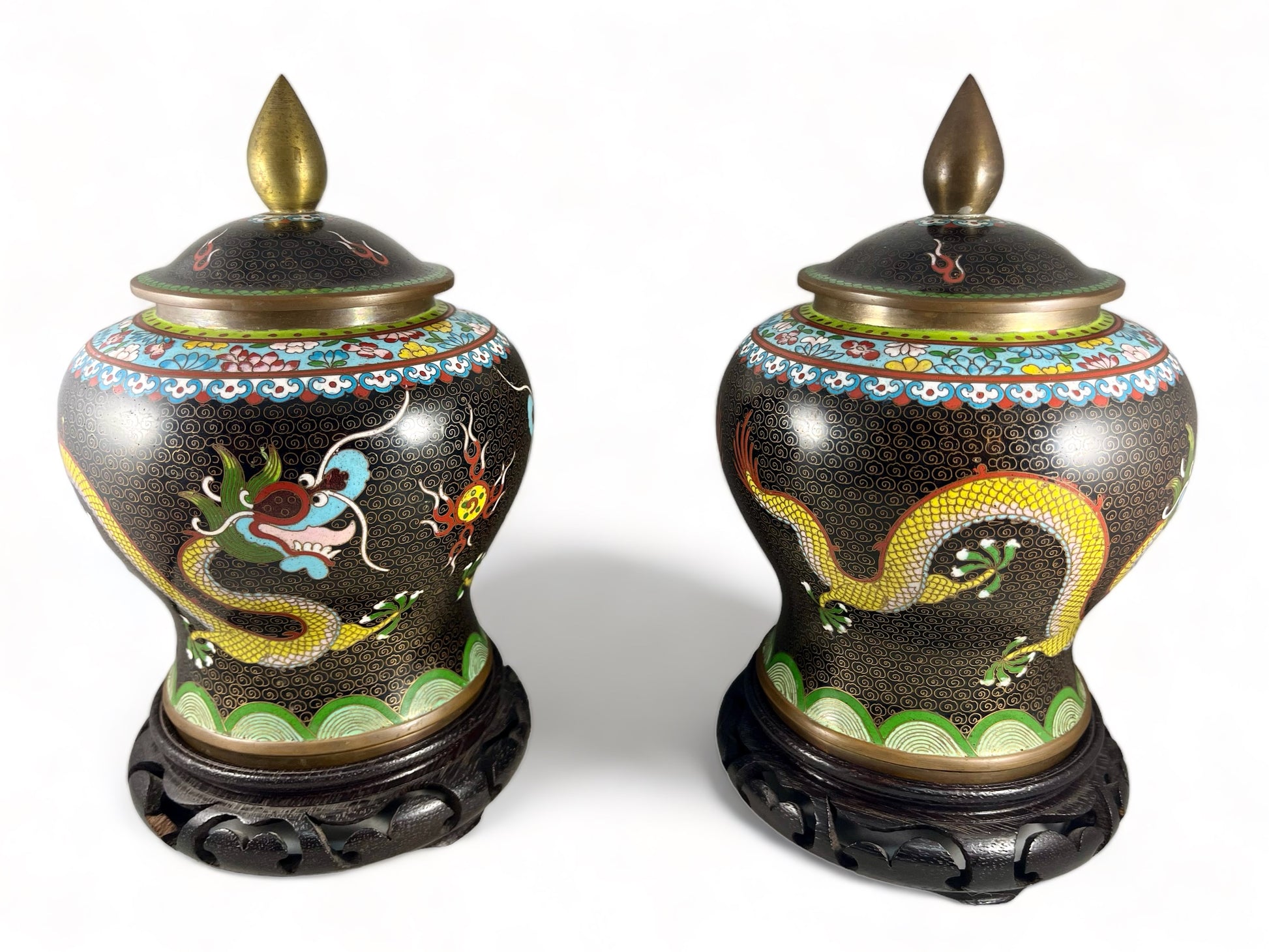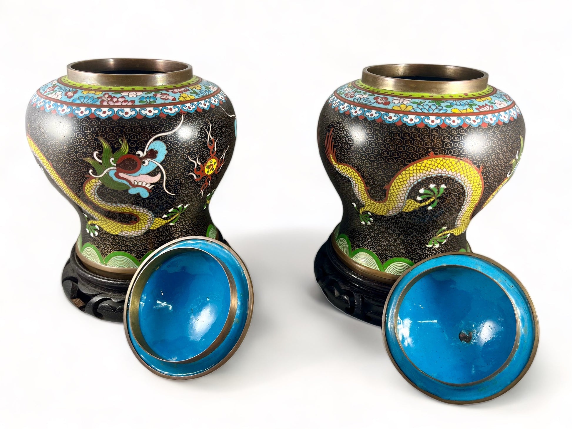 A pair of black enamel brass wire lidded urns, the main body of the urns is decorated with a multi-colored 5 claw dragon reaching for a frery pearl, around the top and base of the urns is a floral and chinese cloud pattern set into a blue and green background.