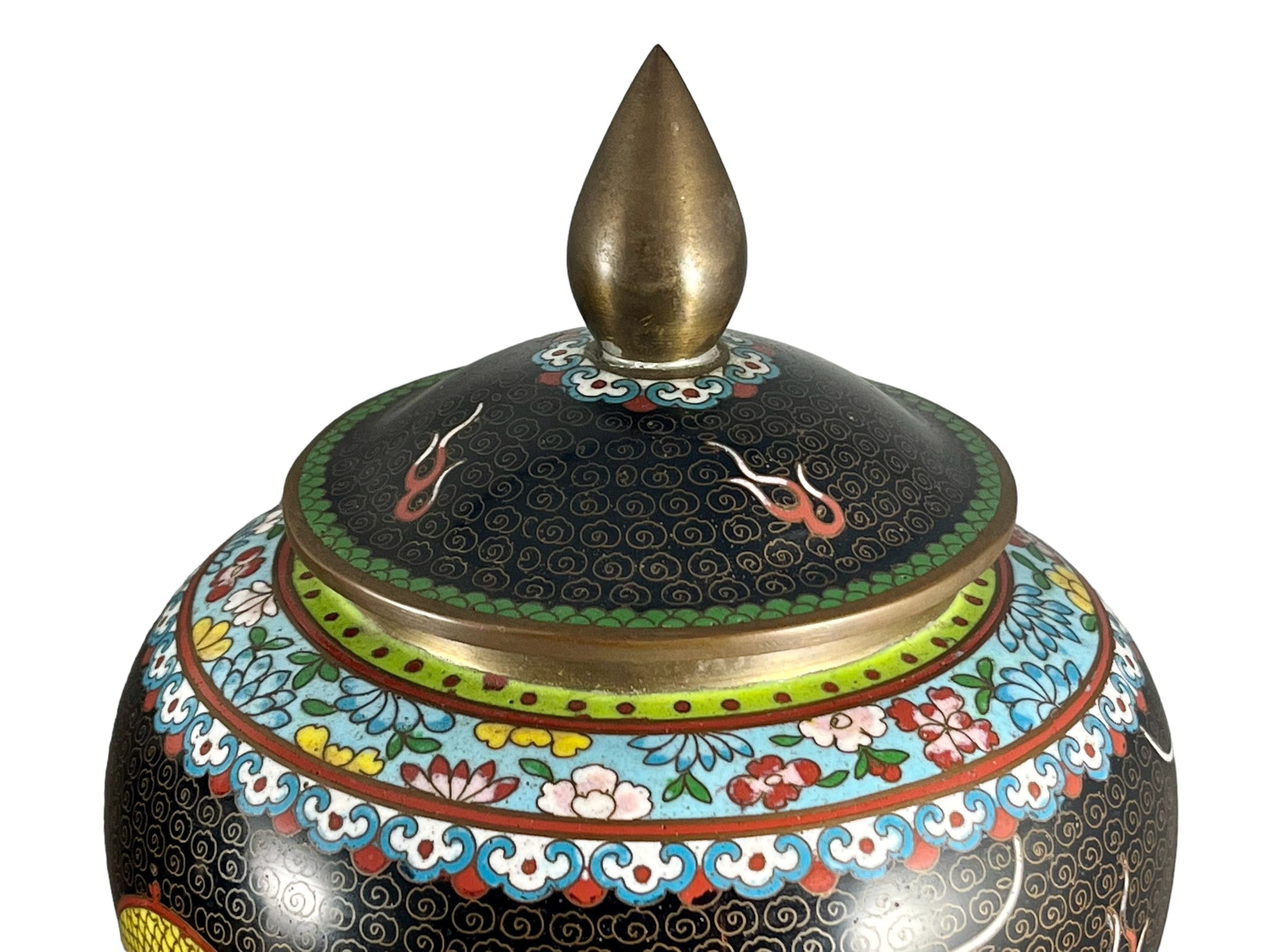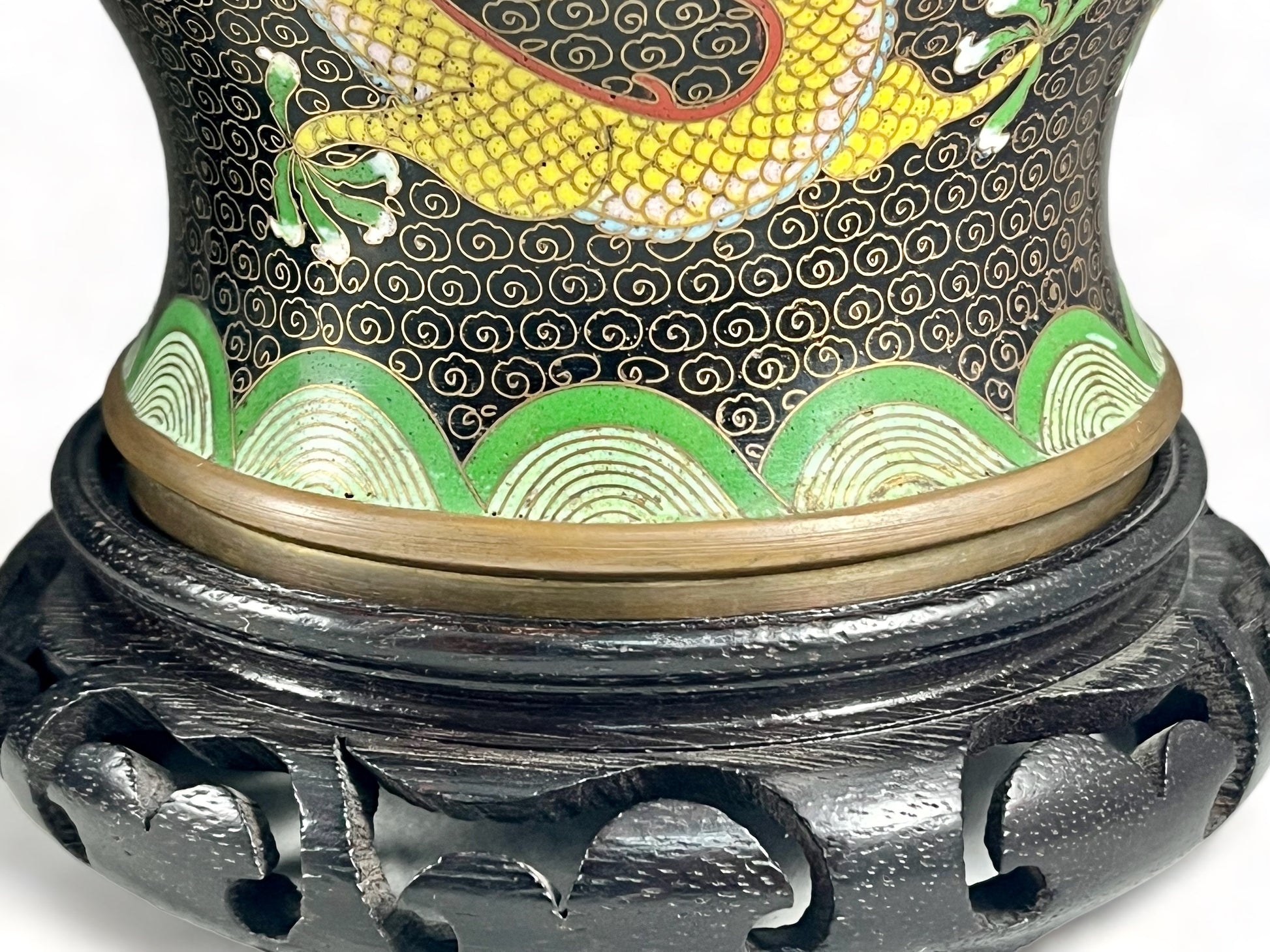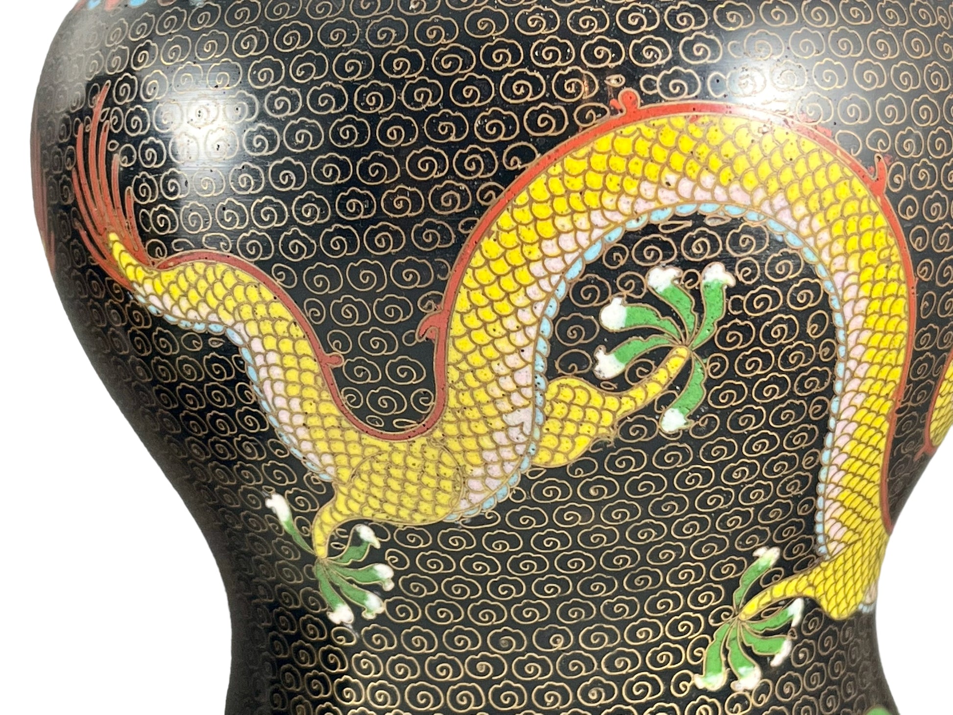 A pair of black enamel brass wire lidded urns, the main body of the urns is decorated with a multi-colored 5 claw dragon reaching for a frery pearl, around the top and base of the urns is a floral and chinese cloud pattern set into a blue and green background.