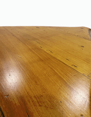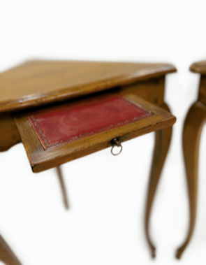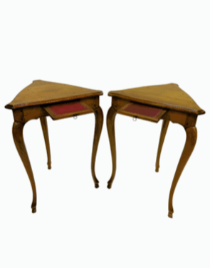 A very rare and unique pair of 19th.century French triangle shaped cherrywood corner tables, fitted with leather inserted candle slides.