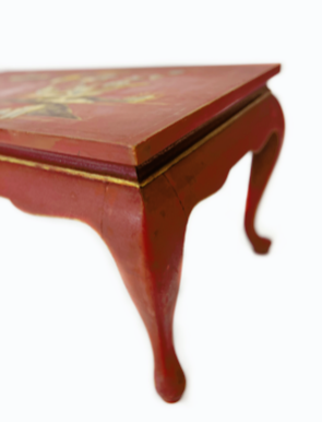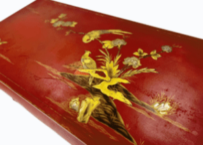 The red lacquer background shows signs of ware consistent with the tables age and use.